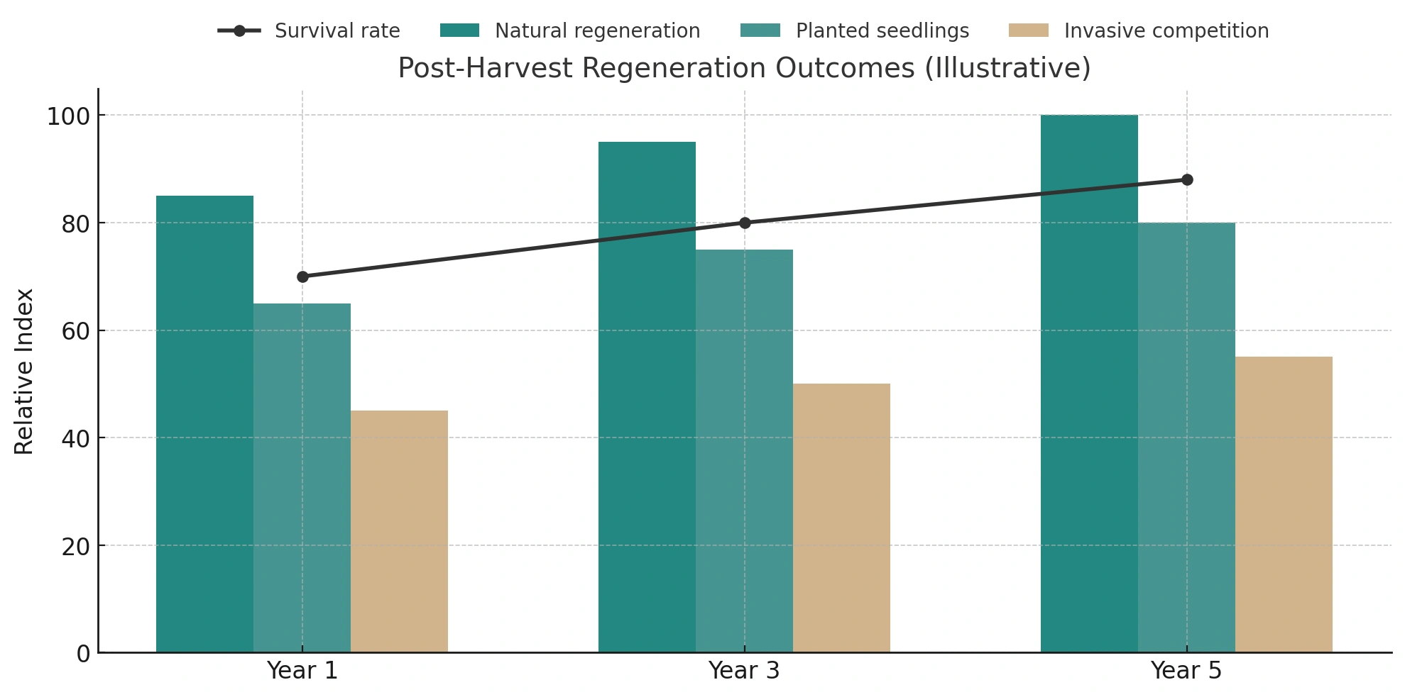- Planting quality seedlings where key species are missing or heavily browsed.